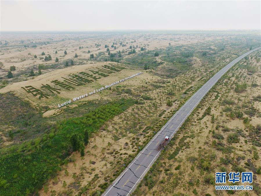 庫(kù)布其沙漠中的一條穿沙公路,兩旁綠意盎然(8月1日無(wú)人機(jī)拍攝)。 新華社記者劉磊攝