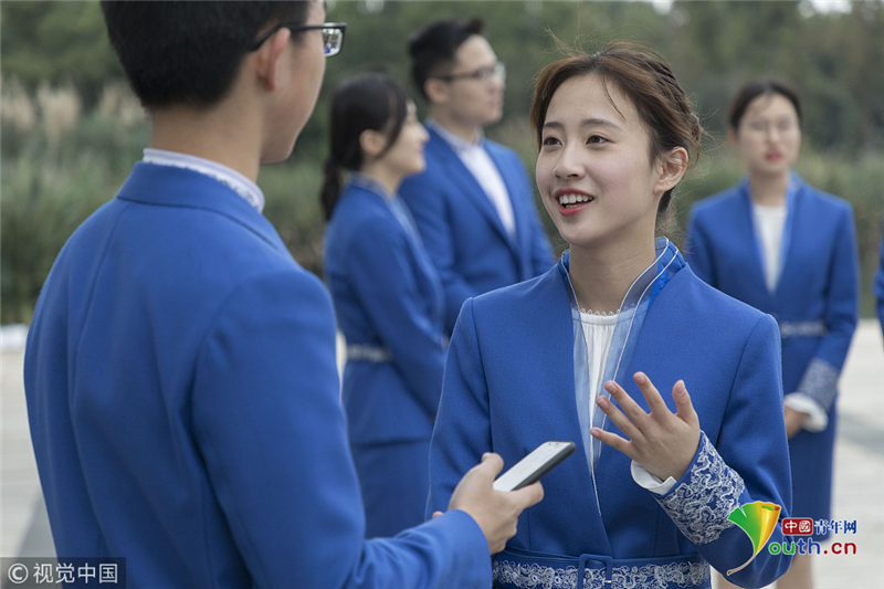 2018年11月1日,浙江省桐鄉(xiāng)市,第五屆世界互聯(lián)網大會志愿者“小梧桐”出征。圖片作者:王振宇/視覺中國