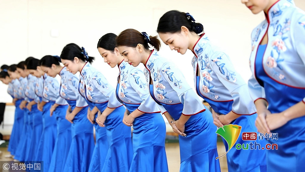 2018年10月15日,杭州,第五屆世界互聯(lián)網大會召開在即,來自浙江傳媒學院的禮儀志愿者們正在進行緊張有序的集中訓練。圖片作者:浙江日報 馮賀/視覺中國