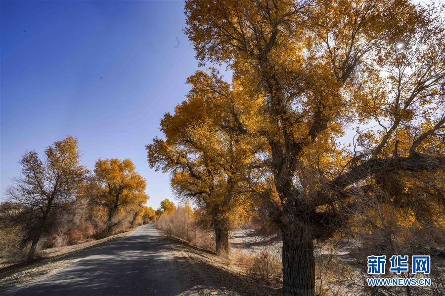 新疆尉犁縣胡楊林深處的一條小路(10月25日攝)。 10月中下旬,靜靜的塔里木河中下游一片金黃。胡楊深處,條條小路蜿蜒綿長通向遠(yuǎn)方,引人入勝。 塔里木河是中國最長的內(nèi)陸河,這一區(qū)域原始胡楊林分布較為集中。隨著塔里木河連續(xù)19次向下游生態(tài)輸水,為胡楊林“解渴”,塔河兩岸生態(tài)得到明顯改善,沙地面積逐年減少。 新華社記者趙戈攝