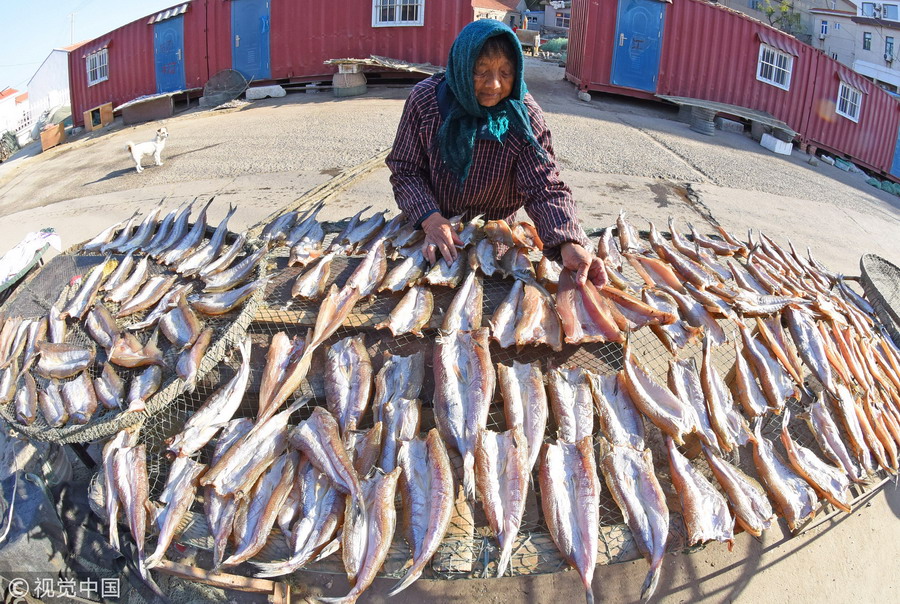 金秋時(shí)節(jié),江蘇連云港市沿海秋捕迎來豐收,漁民們將捕獲的鯧魚、鰻魚、小黃魚、烏賊等經(jīng)過腌制、晾曬加工成魚干,海島處處呈現(xiàn)出一派豐收景象。