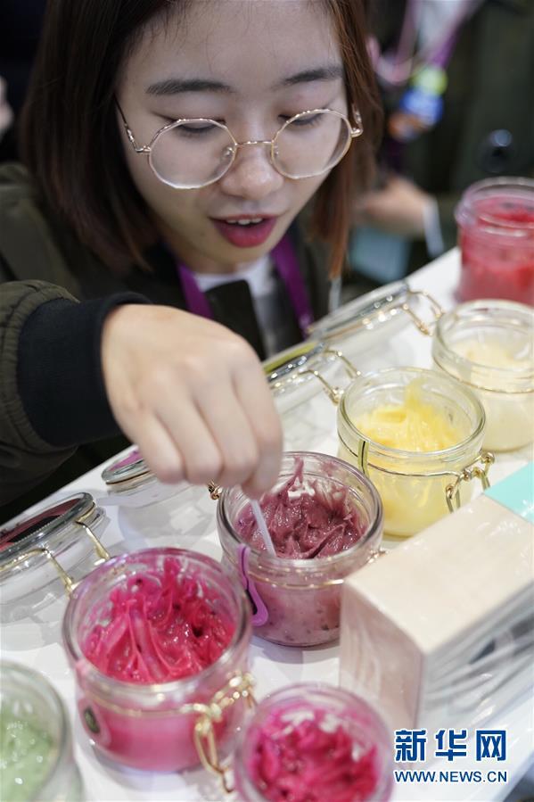 11月7日,在進(jìn)博會食品及農(nóng)產(chǎn)品展區(qū)的一家俄羅斯企業(yè)展位,一名參觀者品嘗混合純天然果汁的蜂蜜產(chǎn)品。 新華社記者 沈伯韓 攝