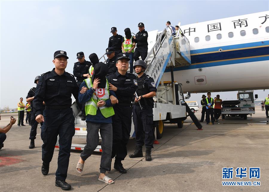 11月7日,涉及到吉林部分網(wǎng)絡(luò)詐騙案件的14名犯罪嫌疑人繼續(xù)乘坐包機(jī)被押解回吉林接受處理。新華社記者毛思倩攝
