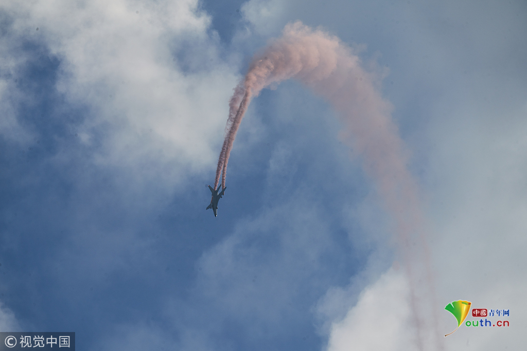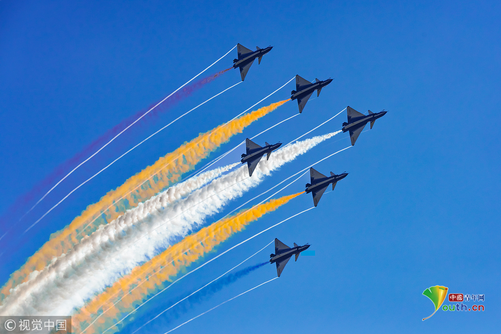 2018年11月8日,廣東珠海,第十二屆中國國際航展第三天??哲姟鞍艘弧憋w行表演隊(duì)的隊(duì)員們,發(fā)揚(yáng)連續(xù)作戰(zhàn)精神,給觀眾們表演了七機(jī)分組開花、四機(jī)編隊(duì)橫滾等高難動(dòng)作,受到觀眾們的稱贊。視覺中國