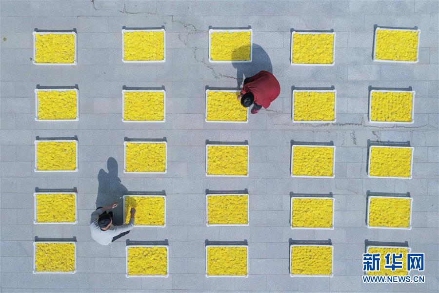 11月7日,河北省魏縣魏城鎮(zhèn)町上村農民在分揀晾曬菊花(無人機拍攝)。 新華社記者 朱旭東 攝