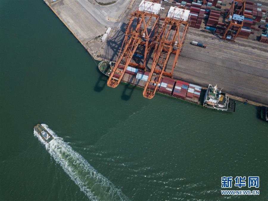 一艘海輪停泊在廣西欽州保稅港區(qū)碼頭裝運(yùn)貨物(11月3日無人機(jī)拍攝)。