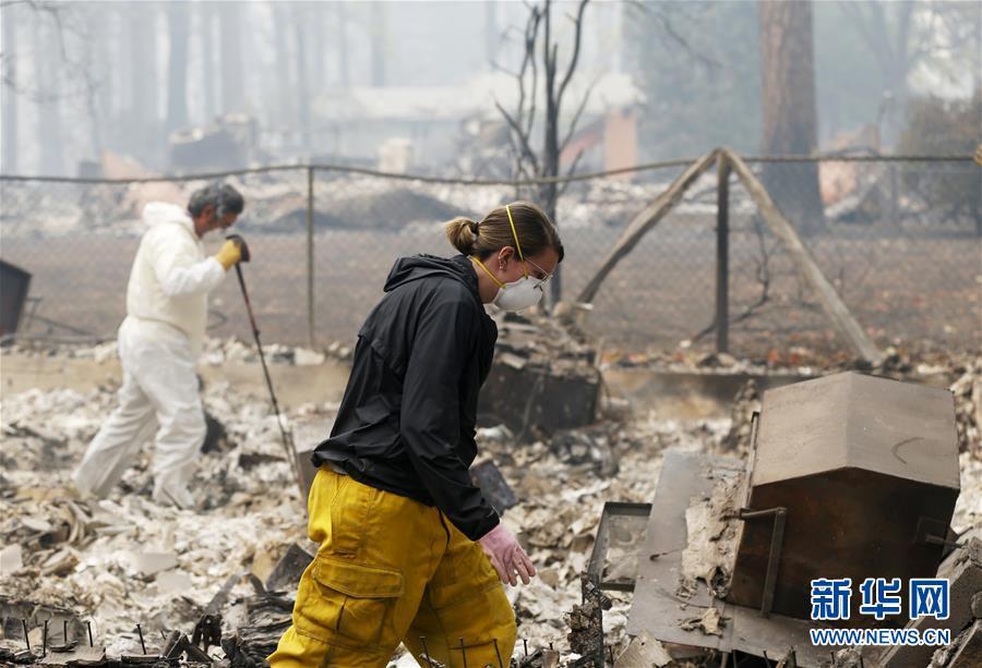 11月13日,在美國(guó)加利福尼亞州天堂鎮(zhèn),搜救人員在山火過后的廢墟工作。