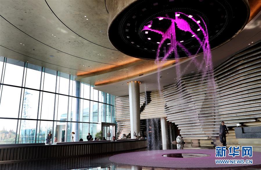 這是世茂洲際酒店大堂內(nèi)的水幕裝置(11月13日攝)。 位于上海松江的世茂洲際酒店11月15日正式開門營業(yè)。這家在一個廢棄采石礦坑內(nèi)建成的酒店成為上海又一新景。 新華社記者 方喆 攝