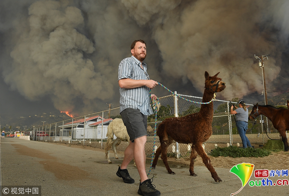 當(dāng)?shù)貢r間2018年11月10日,美國加州Paradise,當(dāng)?shù)厣交鹚僚?,?zāi)區(qū)民眾紛紛帶領(lǐng)家畜進行轉(zhuǎn)移。自本周三開始,加州多地發(fā)生山火,火勢蔓延迅猛,數(shù)萬人被迫撤離,數(shù)以萬計的房屋被燒毀。圖片作者:Jessica Christian