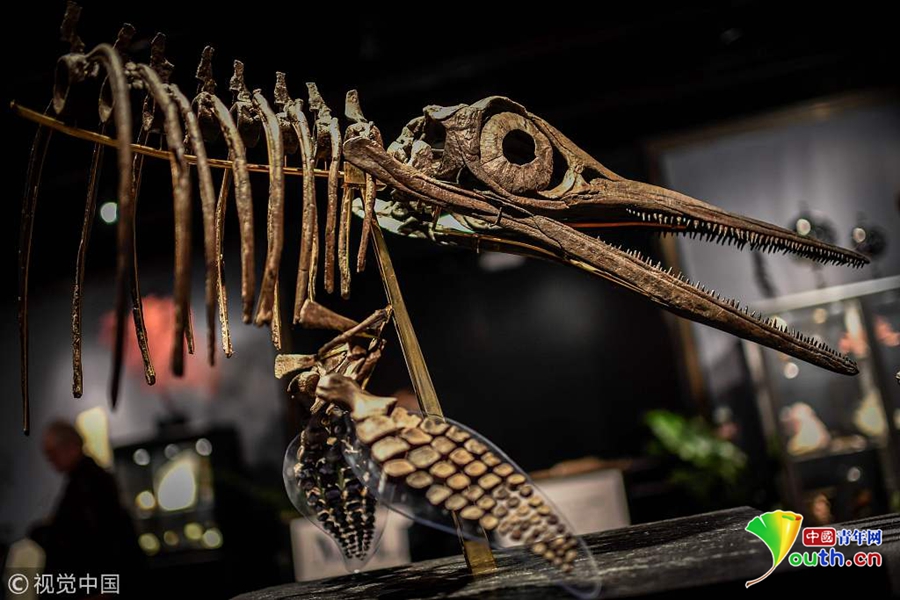 當(dāng)?shù)貢r(shí)間2018年11月19日,法國(guó)巴黎,在展出中的1.8億年前侏羅紀(jì)時(shí)期的恐龍骨架,將于11月20日在Drouot拍賣行拍賣。圖片來(lái)源:視覺(jué)中國(guó)