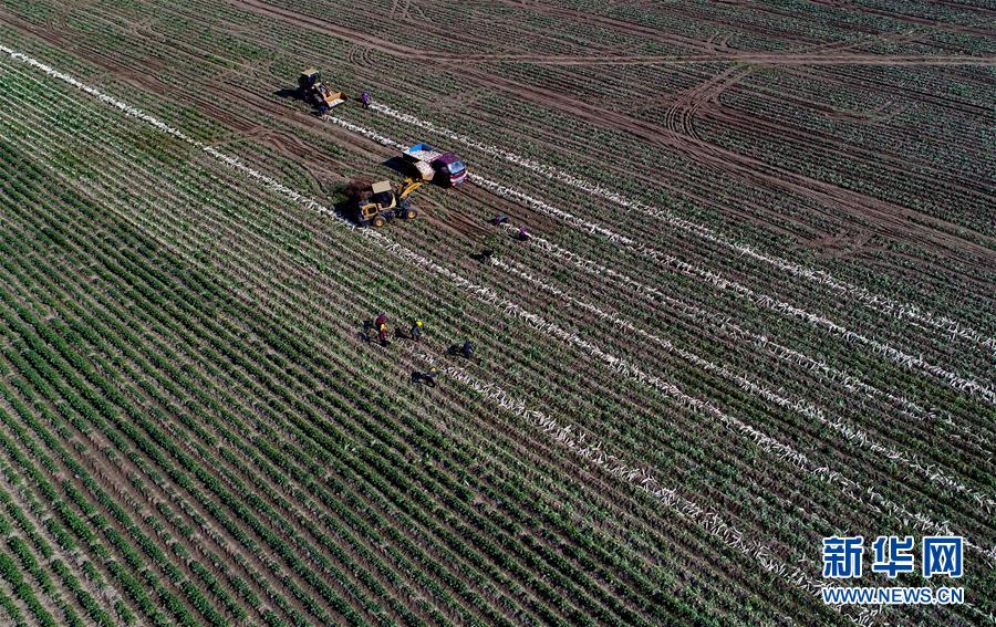 黃驊市常郭鎮(zhèn)一種植專(zhuān)業(yè)合作社社員在收獲白蘿卜(11月19日無(wú)人機(jī)拍攝)。 新華社記者 楊世堯 攝