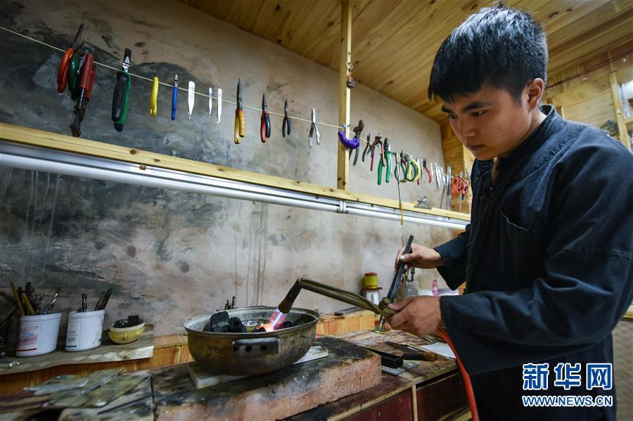龍懂陽(yáng)的弟弟龍?zhí)?yáng)也是銀飾工藝傳人。和哥哥不同,弟弟主打的是銀飾文化體驗(yàn)游,用自家傳統(tǒng)苗寨開設(shè)民宿,游客在此居住的同時(shí),還能學(xué)習(xí)體驗(yàn)銀飾品制作。每年暑期一到,家長(zhǎng)孩子絡(luò)繹不絕。新客源、新銷路、新模式帶動(dòng)雷山縣銀飾業(yè)不斷發(fā)展壯大,成為脫貧攻堅(jiān)的重要產(chǎn)業(yè)。2017年,雷山縣控拜、麻料、烏高三個(gè)村銀飾品及相關(guān)產(chǎn)業(yè)銷售額超過1.5億元,吸引很多外出打工的年輕人回家創(chuàng)業(yè)。苗寨鍛銀聲在綠水青山間響遍千戶,也漸漸走出大山,聲名遠(yuǎn)播。新華社記者 李芒茫 攝