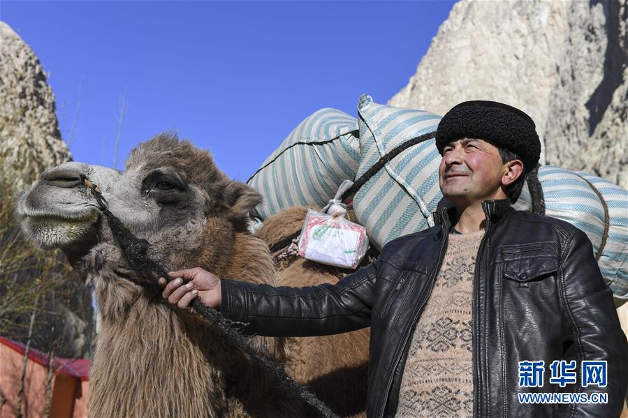 都熱·加爾曼牽著馱有搬遷行李的駱駝走在喀喇昆侖山中(11月17日攝)。