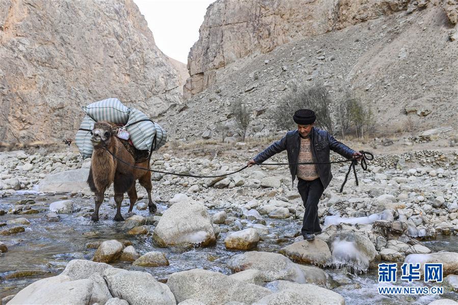 在去往阿克托尕欄桿村村委會(huì)的路上,都熱·加爾曼牽著馱有行李的駱駝通過山間河流(11月17日攝)。新華社記者胡虎虎攝