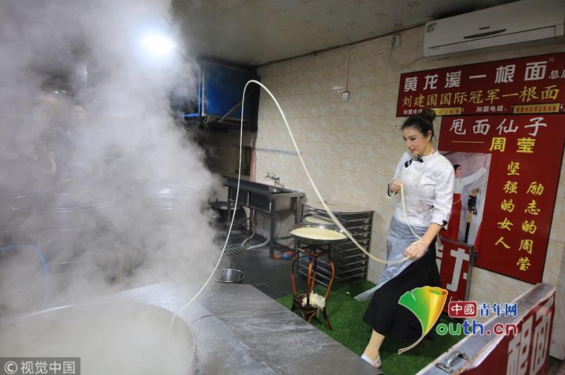 2018年11月19日,成都,繼“妖嬈拉面哥”之后,黃龍溪古鎮(zhèn)一個(gè)身材高挑的古裝美女,一邊跳舞一邊揮甩著手中的面條被贊“甩面仙子”走紅網(wǎng)絡(luò)。圖片作者:紅葉/視覺(jué)中國(guó)