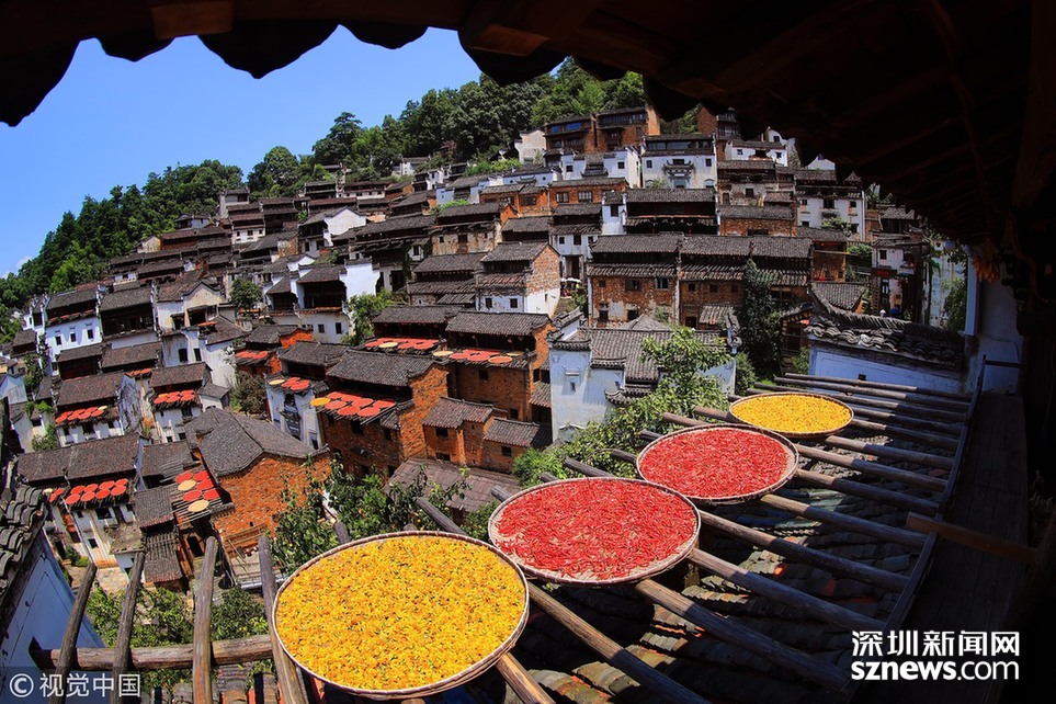 2018年8月7日,江西婺源縣篁嶺古村,壯觀的“曬秋”場景。 深圳新聞網(wǎng)訊 2018年8月7日,江西婺源縣篁嶺古村落,壯觀“曬秋”場景。當日立秋節(jié)氣,江西婺源縣篁嶺古村的農(nóng)作物普遍豐收,村民們又迎來了一年一度的“曬秋”季。村民們將收獲來的紅辣椒、玉米、南瓜、稻谷和菊花等色彩斑斕的農(nóng)作物,晾曬在依山而建的徽派民居房前屋后的木制曬架上,在秋日陽光的照射下,色彩繽紛圓圓的曬扁,鋪就在錯落有致的徽派民居之間,格外璀璨奪目,蔚為壯觀。目前,“篁嶺曬秋”已經(jīng)成為中國鄉(xiāng)村旅游的一張名片。