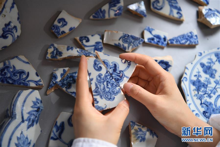 在江西景德鎮(zhèn)御窯廠遺址,工作人員正在修復(fù)明代瓷枕(9月20日攝)。 新華社記者 萬(wàn)象 攝