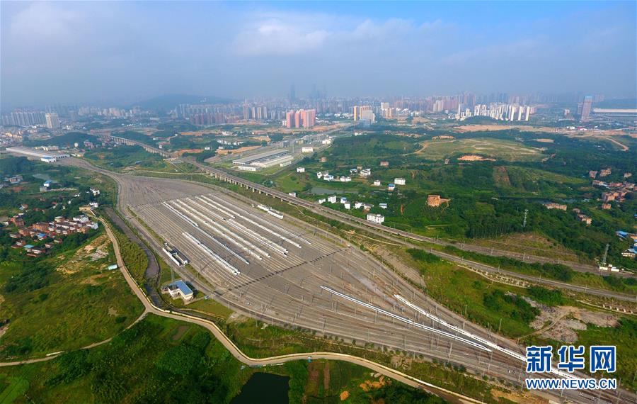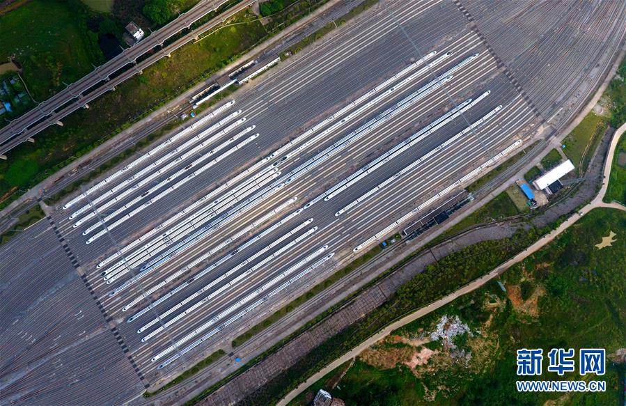 這是廣西南寧動(dòng)車所內(nèi)準(zhǔn)備發(fā)往各地的動(dòng)車組列車(6月18日無(wú)人機(jī)拍攝)。 廣西壯族自治區(qū)成立60年來(lái),鐵路建設(shè)發(fā)生翻天覆地的變化。來(lái)自中國(guó)鐵路南寧局集團(tuán)有限公司的數(shù)據(jù)顯示,1958年廣西鐵路總里程為1346.3公里,如今廣西鐵路總里程達(dá)5191公里。廣西與周邊相鄰省份間實(shí)現(xiàn)動(dòng)車“公交化”開(kāi)行。此外,北部灣港—重慶班列、東盟海產(chǎn)品冷鏈班列、“百色一號(hào)”果蔬專列等的開(kāi)通和運(yùn)營(yíng),強(qiáng)化了鐵路供給的針對(duì)性和有效性。鐵路成為助推廣西經(jīng)濟(jì)社會(huì)快速發(fā)展的“大動(dòng)脈”。 新華社記者黃孝邦攝