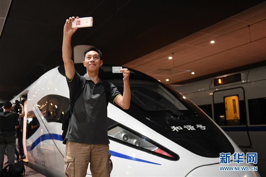 2018年9月23日,廣深港高鐵全線開(kāi)通,搭乘G5711次高鐵列車前往香港西九龍站的乘客在深圳北站拍照留念。新華社記者毛思倩 攝