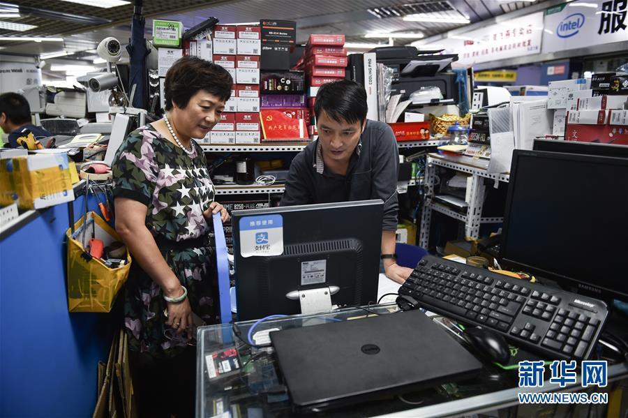 倪海真(左)到深圳華強(qiáng)北賽格電子市場(chǎng)五層的支部宣傳委員陳亞林柜臺(tái)前,與他溝通近期支部黨員學(xué)習(xí)的情況(2017年9月5日攝)。新華社記者毛思倩 攝 圖片來(lái)源:新華網(wǎng)