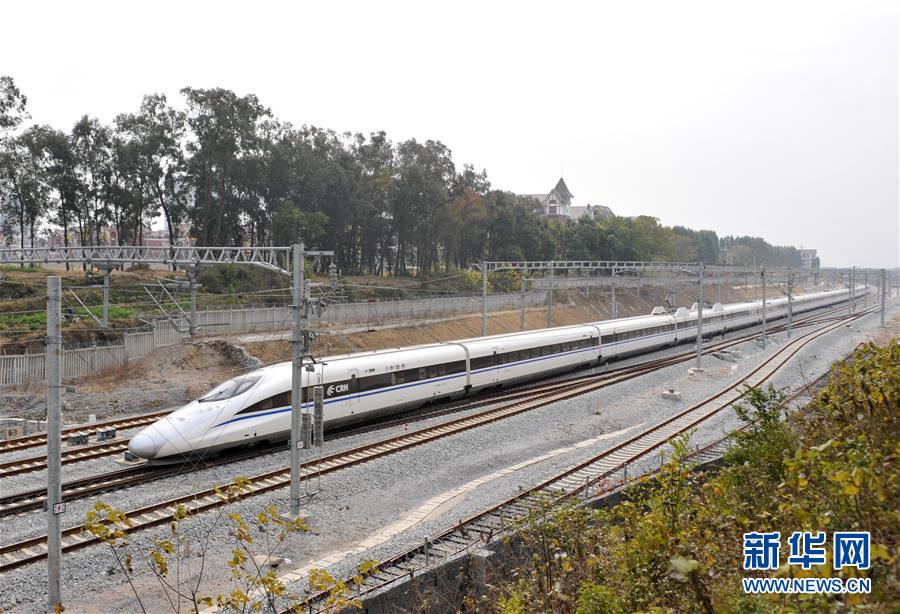 廣西桂林至北京高鐵列車在桂林市靈川縣境內(nèi)行駛(2013年12月28日攝)。 廣西壯族自治區(qū)成立60年來(lái),鐵路建設(shè)發(fā)生翻天覆地的變化。來(lái)自中國(guó)鐵路南寧局集團(tuán)有限公司的數(shù)據(jù)顯示,1958年廣西鐵路總里程為1346.3公里,如今廣西鐵路總里程達(dá)5191公里。廣西與周邊相鄰省份間實(shí)現(xiàn)動(dòng)車“公交化”開(kāi)行。此外,北部灣港—重慶班列、東盟海產(chǎn)品冷鏈班列、“百色一號(hào)”果蔬專列等的開(kāi)通和運(yùn)營(yíng),強(qiáng)化了鐵路供給的針對(duì)性和有效性。鐵路成為助推廣西經(jīng)濟(jì)社會(huì)快速發(fā)展的“大動(dòng)脈”。 新華社記者陸波岸攝