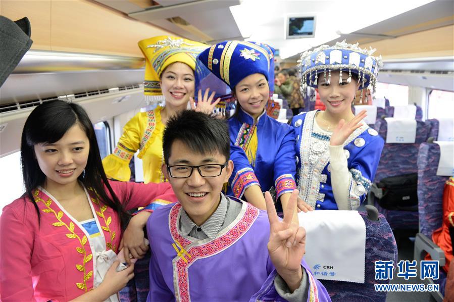 在廣西南寧站,身著民族服裝的乘客搭乘動(dòng)車準(zhǔn)備出行(2013年12月30日攝)。 廣西壯族自治區(qū)成立60年來(lái),鐵路建設(shè)發(fā)生翻天覆地的變化。來(lái)自中國(guó)鐵路南寧局集團(tuán)有限公司的數(shù)據(jù)顯示,1958年廣西鐵路總里程為1346.3公里,如今廣西鐵路總里程達(dá)5191公里。廣西與周邊相鄰省份間實(shí)現(xiàn)動(dòng)車“公交化”開(kāi)行。此外,北部灣港—重慶班列、東盟海產(chǎn)品冷鏈班列、“百色一號(hào)”果蔬專列等的開(kāi)通和運(yùn)營(yíng),強(qiáng)化了鐵路供給的針對(duì)性和有效性。鐵路成為助推廣西經(jīng)濟(jì)社會(huì)快速發(fā)展的“大動(dòng)脈”。 新華社記者周華攝