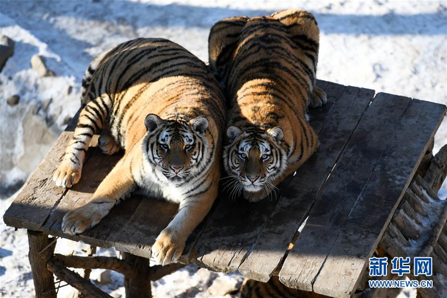 在橫道河子?xùn)|北虎林園散放區(qū),兩只東北虎在木架子上休息(11月21日攝)。新華社記者王建威攝