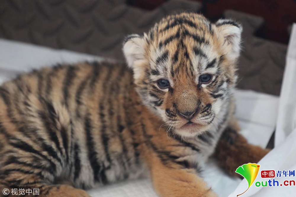 一只剛出生不到一個(gè)月的小東北虎寶寶。