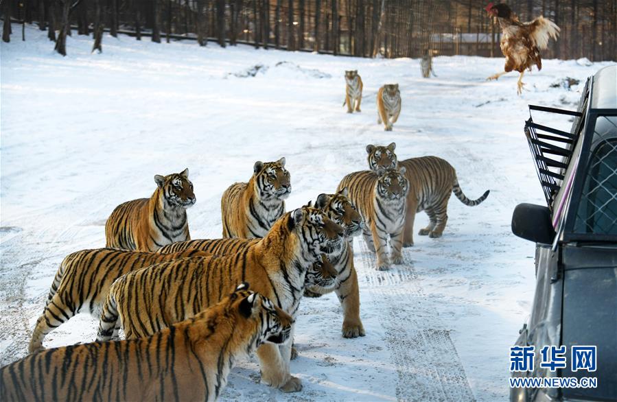 在橫道河子?xùn)|北虎林園散放區(qū),一群東北虎準備捕食投放的活雞(11月21日攝)。新華社記者王建威攝