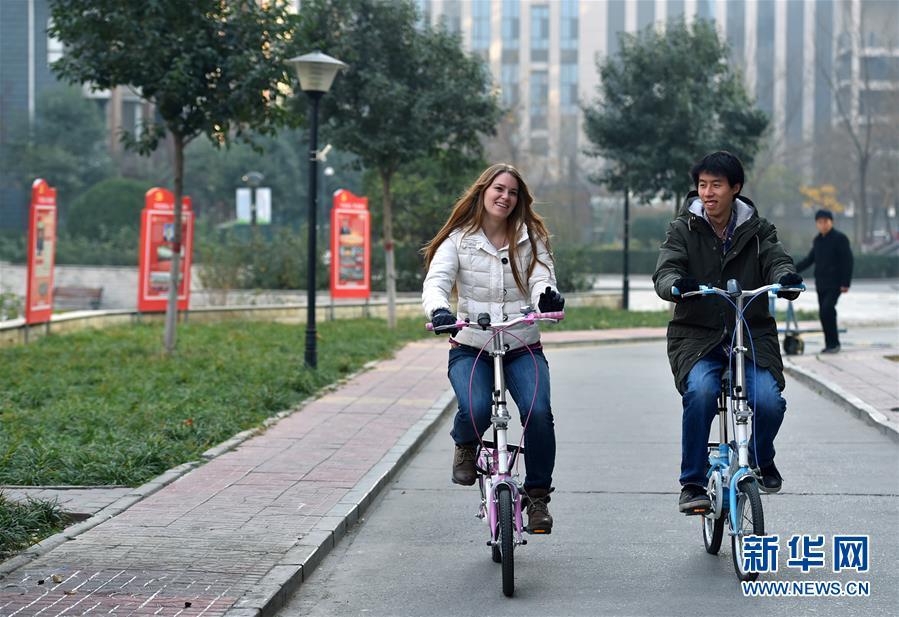 11月24日,艾米莉和愛人郭了達(dá)一起騎車出行。 新華社發(fā)(張曉峰 攝)