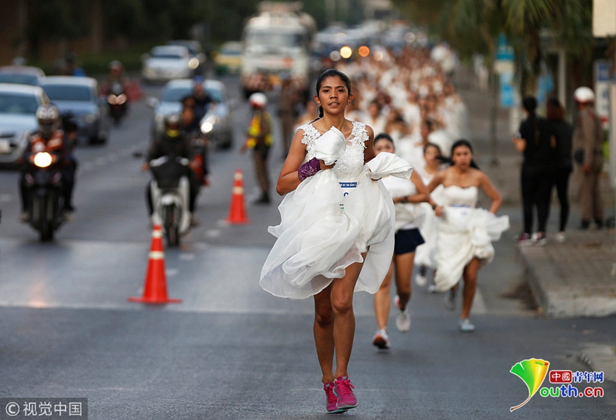 當?shù)貢r間2018年11月24日,泰國曼谷舉辦新娘賽跑活動,獲勝者將獲得婚禮的全額資助,眾多新娘在街頭提裙狂奔。圖片來源:視覺中國
