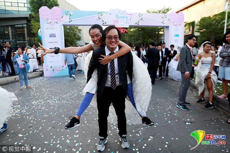當(dāng)?shù)貢r間2018年11月24日,泰國曼谷舉辦新娘賽跑活動,獲勝者將獲得婚禮的全額資助,眾多新娘在街頭提裙狂奔。情侶沖過終點(diǎn)合影。
