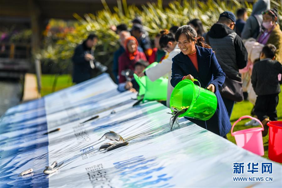 11月23日,市民在活動(dòng)現(xiàn)場(chǎng)投放魚(yú)苗。 新華社記者江文耀攝