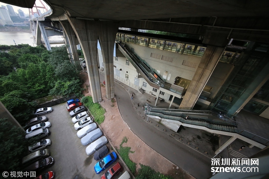 2018年5月29日,重慶,魔幻重慶又雙叒叕放大招!還有一個獨(dú)特的亮點(diǎn),重慶軌道交通3號線銅元局站,出口由一段長梯銜接上方立交橋和下方的路面,與全國最高城市立交橋蘇家壩立交組成了獨(dú)特風(fēng)景,許多游客專門趕來拍照。