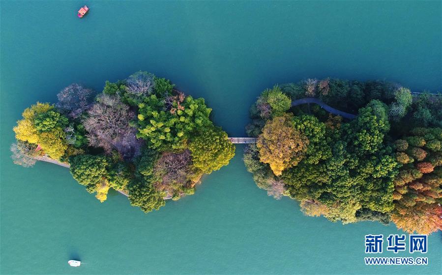 兩只小船行駛在湖南烈士公園年嘉湖湖面(11月25日無人機(jī)拍攝)。 新華社記者 李尕?cái)z