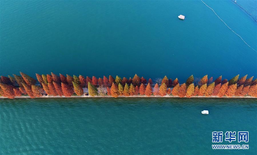 兩只小船行駛在湖南烈士公園年嘉湖湖面(11月25日無人機(jī)拍攝)。新華社記者 李尕?cái)z