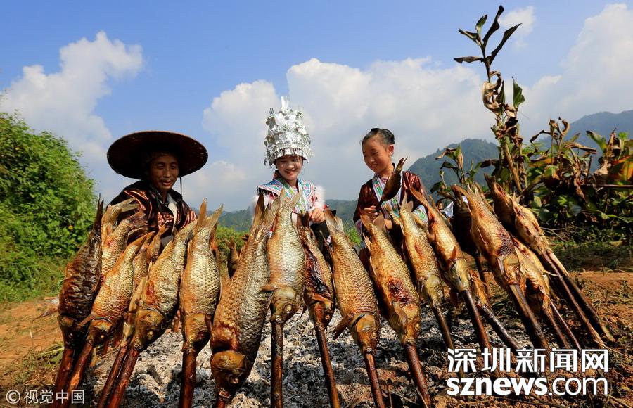 廣西柳州市融水縣山區(qū)有插秧時節(jié)放養(yǎng)鯉魚苗的習(xí)俗,金秋時節(jié)稻熟魚肥,收稻燒魚成為別致一景。