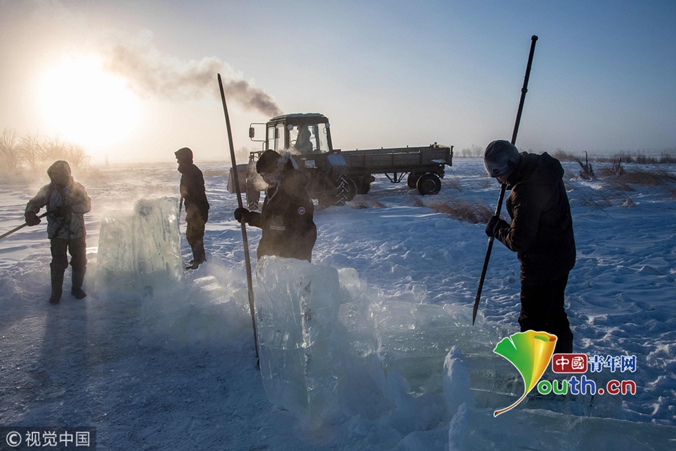 當地時間2018年11月27日,雅庫茨克,零下41攝氏度左右的氣溫下,村民在當地的一個湖中采集冰塊。當地很多人依賴于融化冰塊解決供水,因為多年凍土覆蓋地區(qū)冬季氣溫極低,沒有其他的方式供應水。