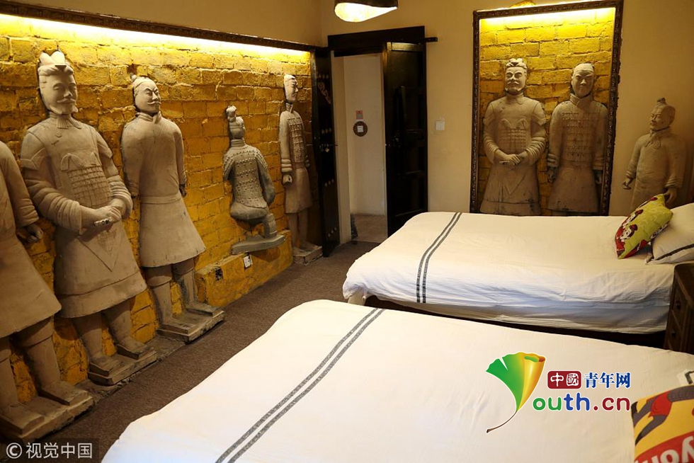 2018年11月27日,西安,民宿臥室內(nèi)的“兵馬俑”裝飾。近日,西安一家主打“兵馬俑”元素的民宿走紅,“兵馬俑”元素遍布在房間各個(gè)角落,“深情注視”著在此休憩的旅客,加上昏黃的燈光及復(fù)古的裝飾,讓不少旅客感嘆如同居住在“秦始皇陵”。 張遠(yuǎn)(陜西分社)/視覺中國(guó)