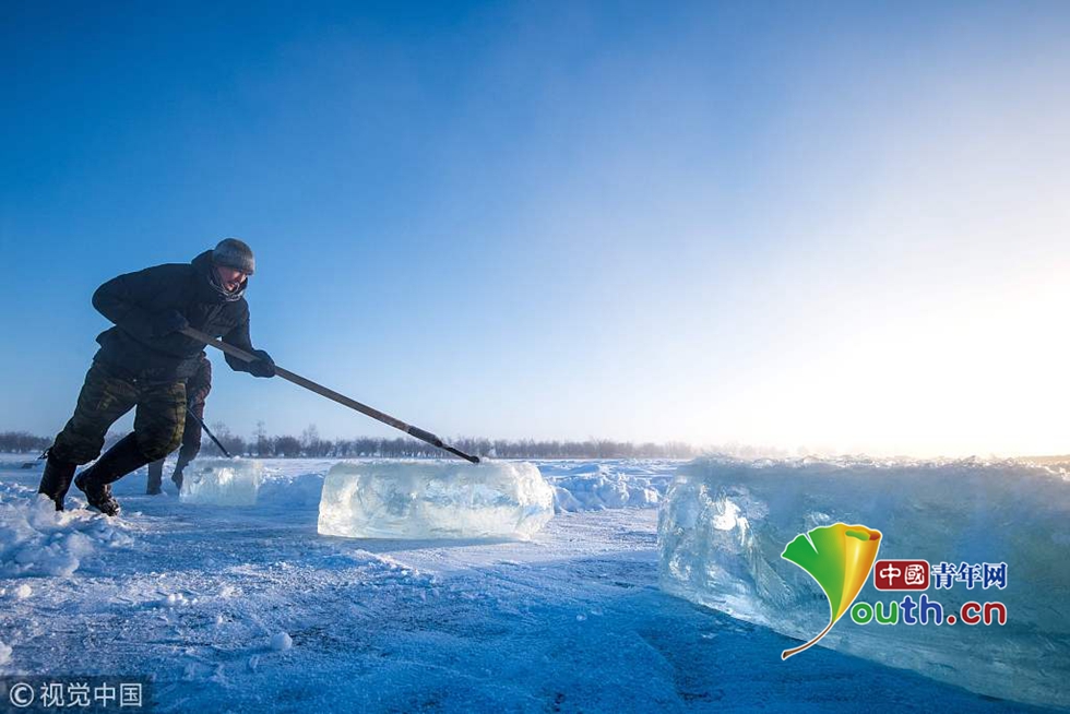 當(dāng)?shù)貢r間2018年11月27日,雅庫茨克,零下41攝氏度左右的氣溫下,村民在當(dāng)?shù)氐囊粋€湖中采集冰塊。當(dāng)?shù)睾芏嗳艘蕾囉谌诨鶋K解決供水,因為多年凍土覆蓋地區(qū)冬季氣溫極低,沒有其他的方式供應(yīng)水。