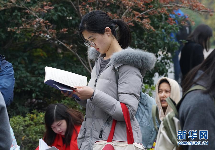 12月2日,在南京林業(yè)大學(xué)考點,一名考生在等候進場時復(fù)習(xí)。 新華社記者 孫參 攝