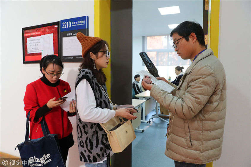 2018年12月02日,江蘇省南京市,考生在南京林業(yè)大學(xué)考點看考場分布。姚家/視覺中國