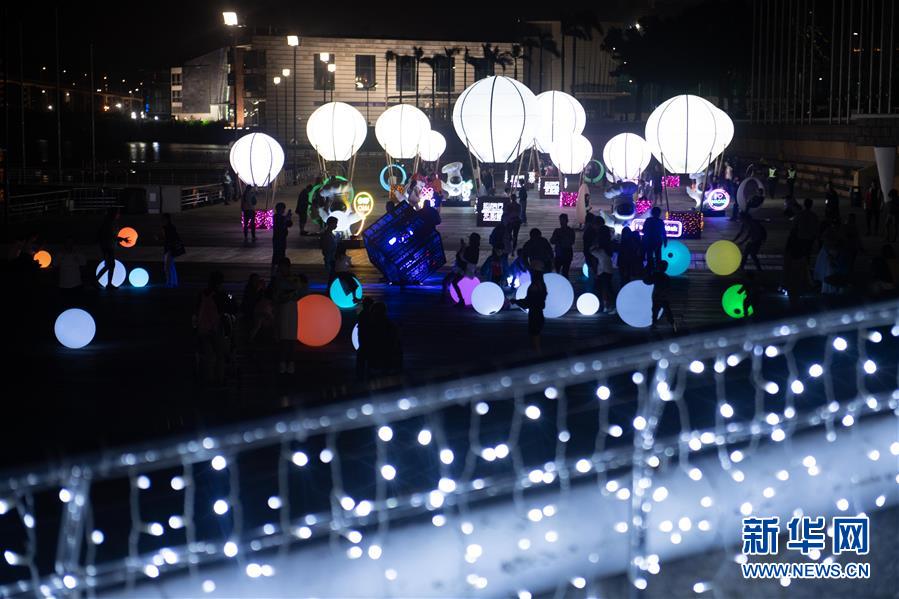 12月2日,人們在澳門南灣湖水上活動(dòng)中心欣賞光影節(jié)裝置。