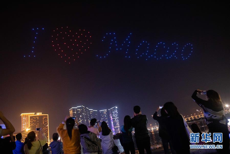 12月2日,無人機(jī)在澳門南灣湖水上活動(dòng)中心進(jìn)行空中圖案表演。 新華社記者 張金加 攝