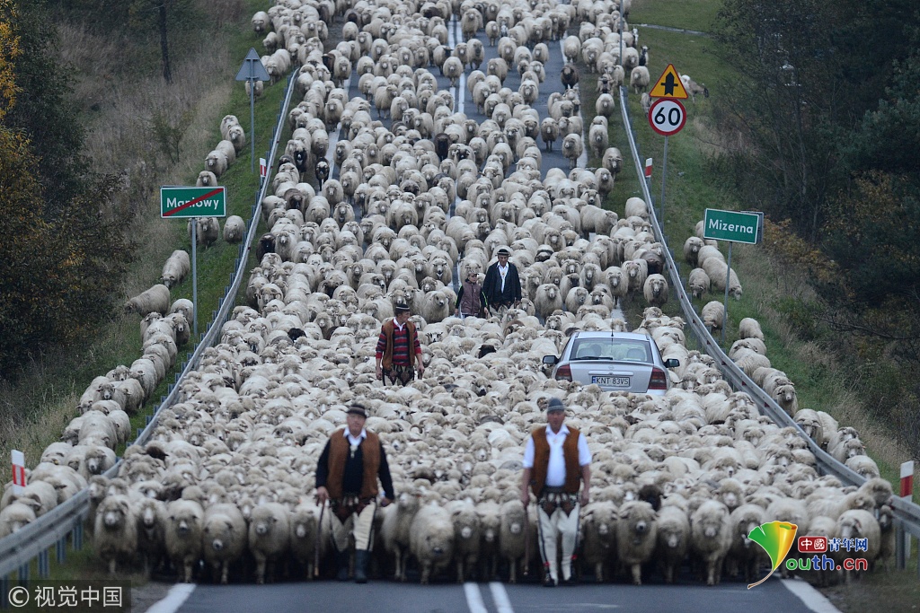 2018年9月27日訊(具體拍攝時(shí)間不詳),波蘭,浩浩蕩蕩的綿羊大軍為了趕在冬天之前回到農(nóng)場(chǎng)過(guò)冬,阻斷了鄉(xiāng)村的主車(chē)道。
