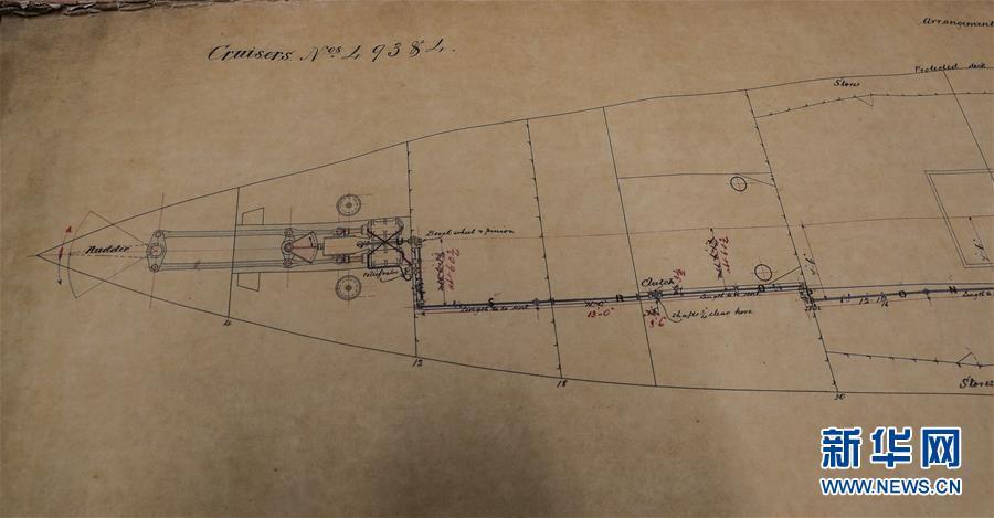 這是11月2日在英國紐卡斯爾的泰恩—威爾檔案館拍攝的致遠艦設計圖紙。 新華社記者日前在紐卡斯爾泰恩—威爾檔案館查找北洋海軍史料時發(fā)現(xiàn)一套七張、檔案名為“中國巡洋艦舵機設計圖”的原始圖紙。塵封百年,甲午海戰(zhàn)中抗擊日艦后沉沒的清北洋海軍致遠艦部分原廠設計圖紙在其建造地——英國紐卡斯爾市的一家檔案館首次被發(fā)現(xiàn),為打撈那段悲壯的歷史提供了重要參考。 新華社記者 韓巖 攝