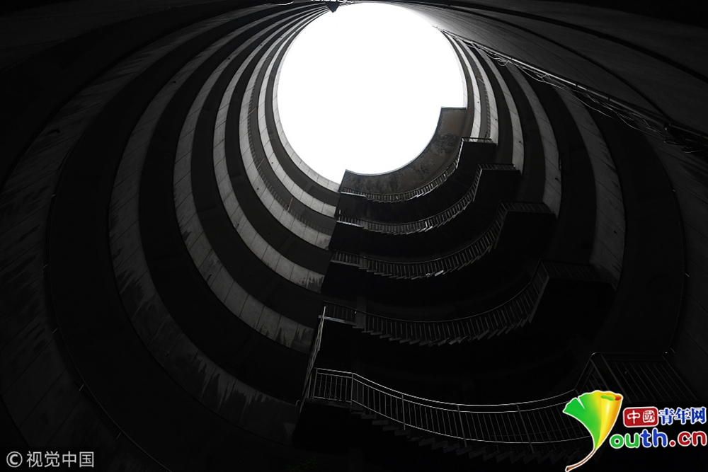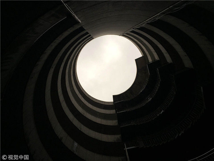 2017年9月27日,重慶,南岸區(qū)某小區(qū)的“螺旋”停車場,從公路到車庫要下5層樓,司機(jī)需要轉(zhuǎn)無數(shù)個(gè)360度圈。圖片來源:視覺中國