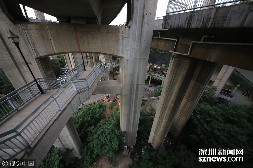 2017年3月16日,重慶,渝中區(qū)一棟大樓從22層架起兩座平行的天橋,連接對面的魁星樓廣場地面。圖片來源:視覺中國 |