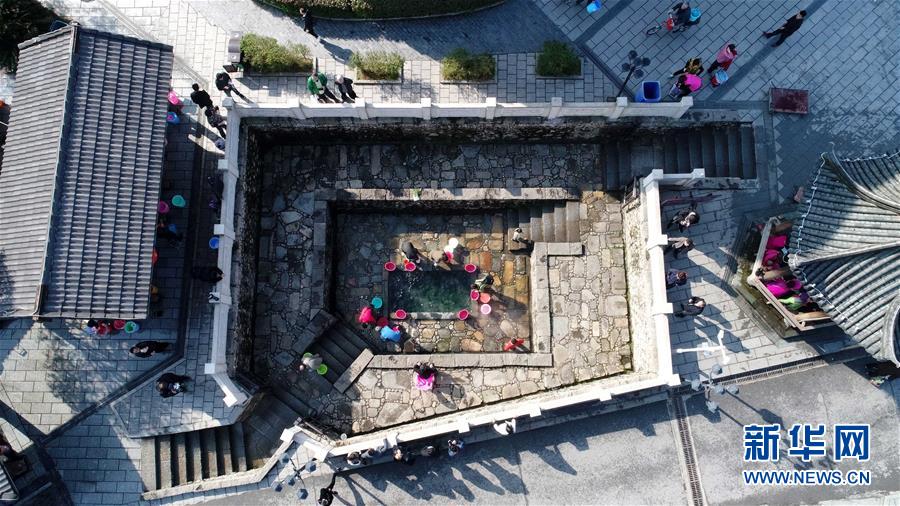 人們在江西宜春溫湯鎮(zhèn)的溫泉泉眼邊打水(2月28日無人機拍攝)。 新華社記者 彭昭之 攝