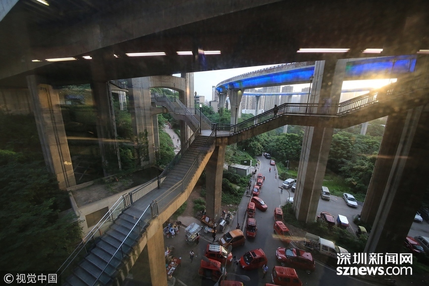 2018年5月29日,重慶,魔幻重慶又雙叒叕放大招!還有一個(gè)獨(dú)特的亮點(diǎn),重慶軌道交通3號(hào)線銅元局站,出口由一段長(zhǎng)梯銜接上方立交橋和下方的路面,與全國(guó)最高城市立交橋蘇家壩立交組成了獨(dú)特風(fēng)景,許多游客專(zhuān)門(mén)趕來(lái)拍照。